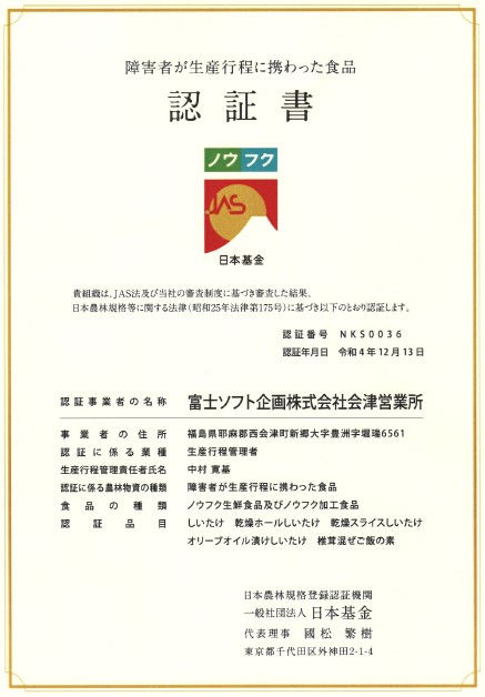 富士ソフト企画㈱「西会津しいたけファーム」がノウフクJAS認証事業者に認定